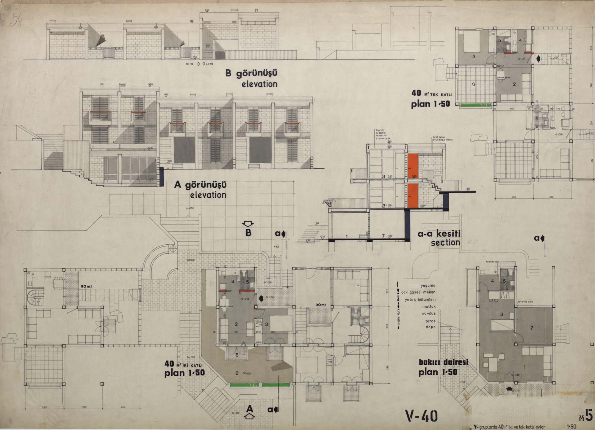 V gruplarda 40 m² iki ve tek katlı evler, planlar, kesit ve görünüşler