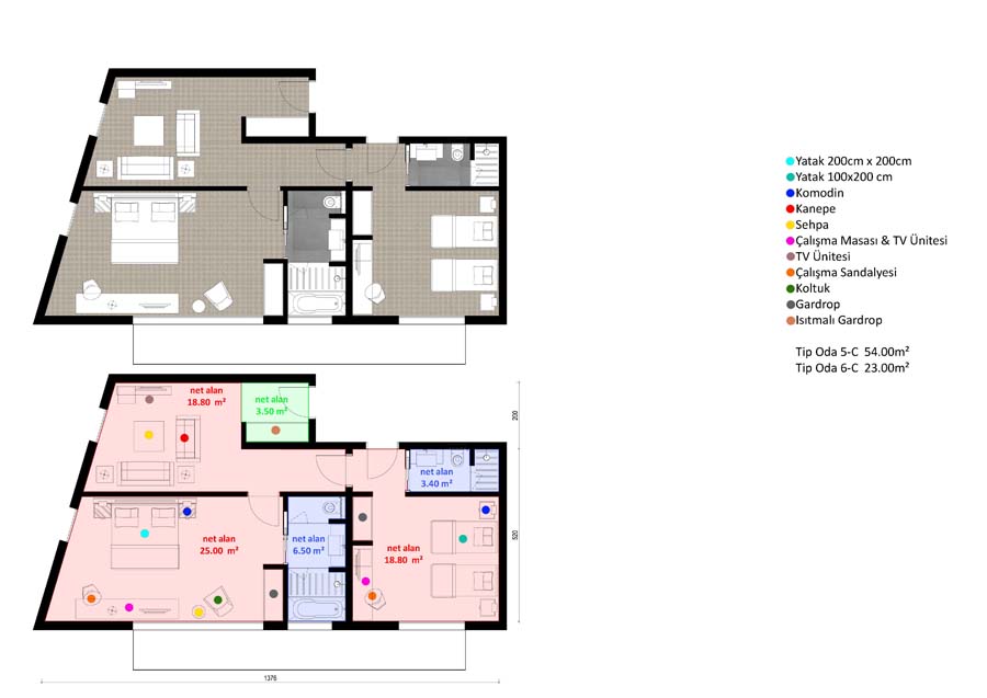 Bağlantılı Junior Suit Oda ve Standart Oda Planları