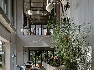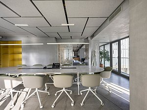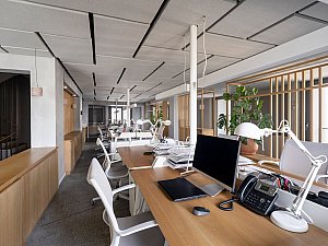 Modern çalışma alışkanlıklarının hızlı temposuna karşıt olarak tasarımın amacı dinginlikti. Ton sür ton renk paleti ve doku geçişleri birlikte çalışarak zarif ve sakin bir atmosfer yaratıyor. Nötr renk paletinin sıcak grileri, ortama canlılık katan fakat huzurlu atmosferi bozmayan renkli mobilyalarla nazikçe dengeleniyor.