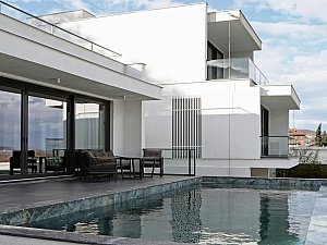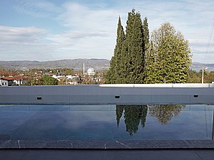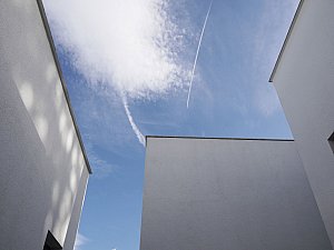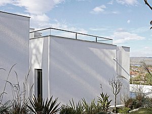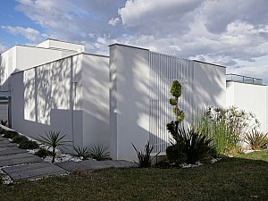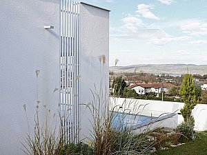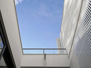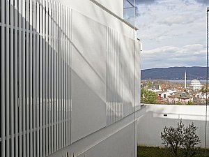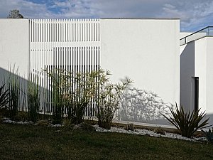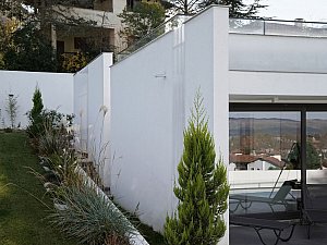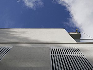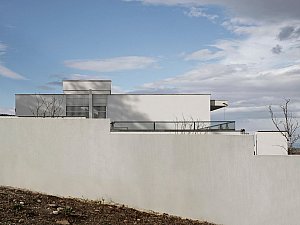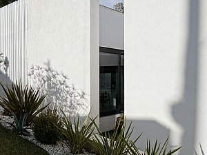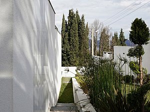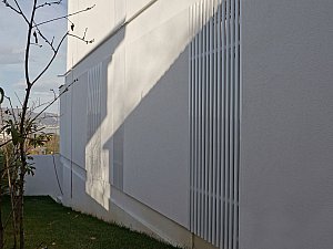 Çevre ile ilişkisinin sınırlanması ve içe dönüklüğün sağlanması amacıyla; yapı çevresinde ve cephesinde peyzaj üzerine yerleştirilen tekil duvarlar ile saydam yüzeyler önünde kullanılan yarı geçirgen sabit cephe panelleri yapının yalın cephe tasarımını oluşturmaktadır.