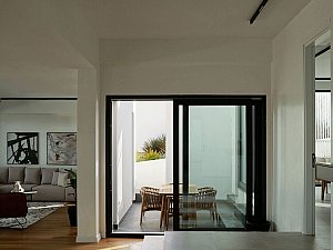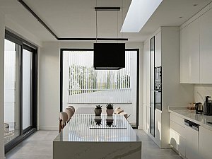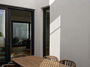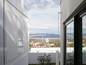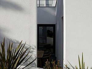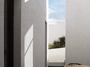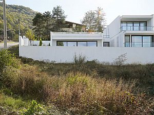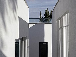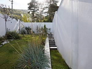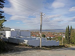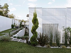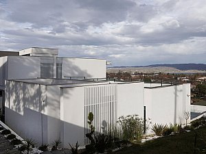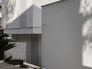 Komşu parsel boyunca eğime dik uzanan 2 katlı ve odaların bulunduğu birinci kütle ile mutfak ve salonun farklı kotlarda ilişkilendiği, yolla ilişkisi minimize edilmiş, üzerinde manzaraya hakim teraslar bulunan tek katlı ikinci kütle, yatayda uzanan ve içerisinde merdiven, karşılama holü ve tüm sirkülasyonları barındıran, her 2 ucu şeffaf genişçe bir üçüncü bağlayıcı ile birleştirilmiştir. Bu 3 kütlenin bir araya gelişleri ile oluşan yapının oluşturduğu nitelikli, kullanılabilir boşlukların, yapı içi ve çevresine iç avlu/bahçe olarak eklemlenmesi sağlanmıştır. Bu boşlukların, gün içerisindeki farklı saatlerde, yapı içerisinde oluşturduğu ışık ve gölge oyunları, yapının canlı bir organizma gibi yaşamasını sağlamaktadır.