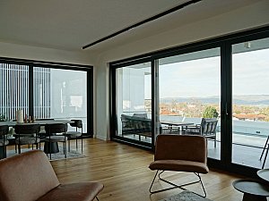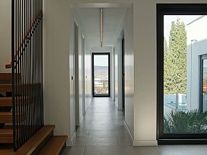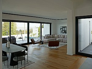 Yapının giriş holünün, birbirine uzak yerleştirilmiş iki farklı kütleyi birleştiren yatay bağlayıcının merkezine yerleştirilmesi ile birlikte, karşılama anında göl ve doğa manzarasına hakim bir görsel ile buluşulması amaçlamıştır. Zemin kat oda önüne yerleştirilen koridor ile holün algısı genişletilerek, yarı geçirgen hale getirilmesi ile elde edilen okunabilir insan hareketi; salon, karşılama, mutfak, odalar ilişkisinin şeffaf bağlayıcı kütle ile birlikte kuvvetlendirilmesini amaçlamıştır.